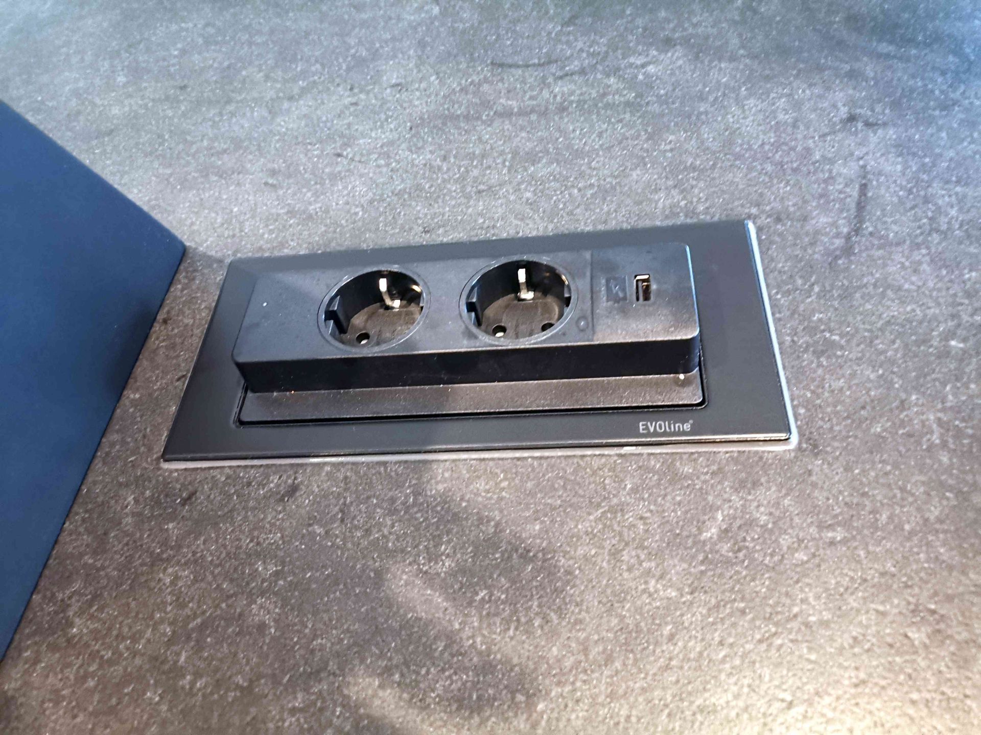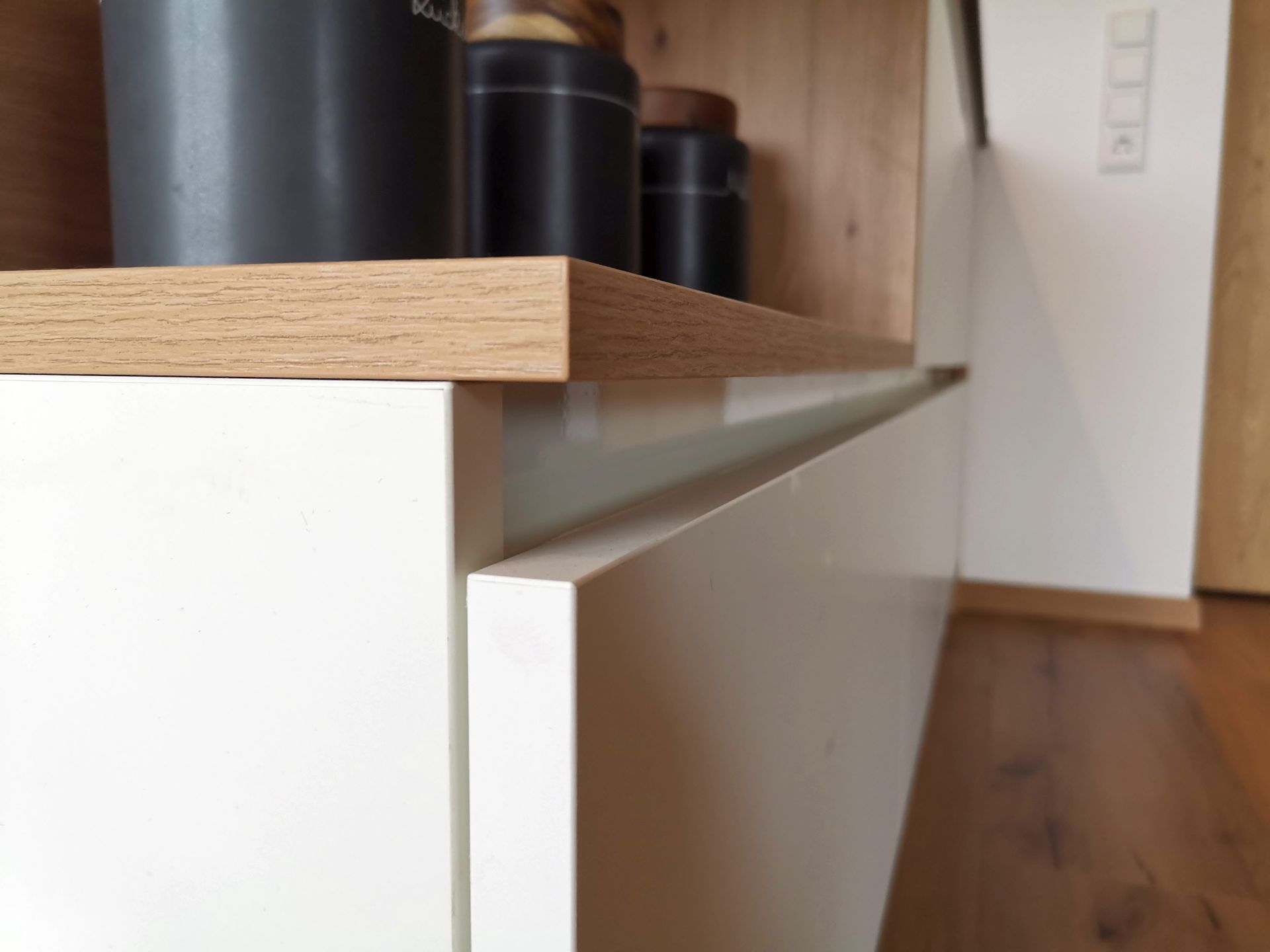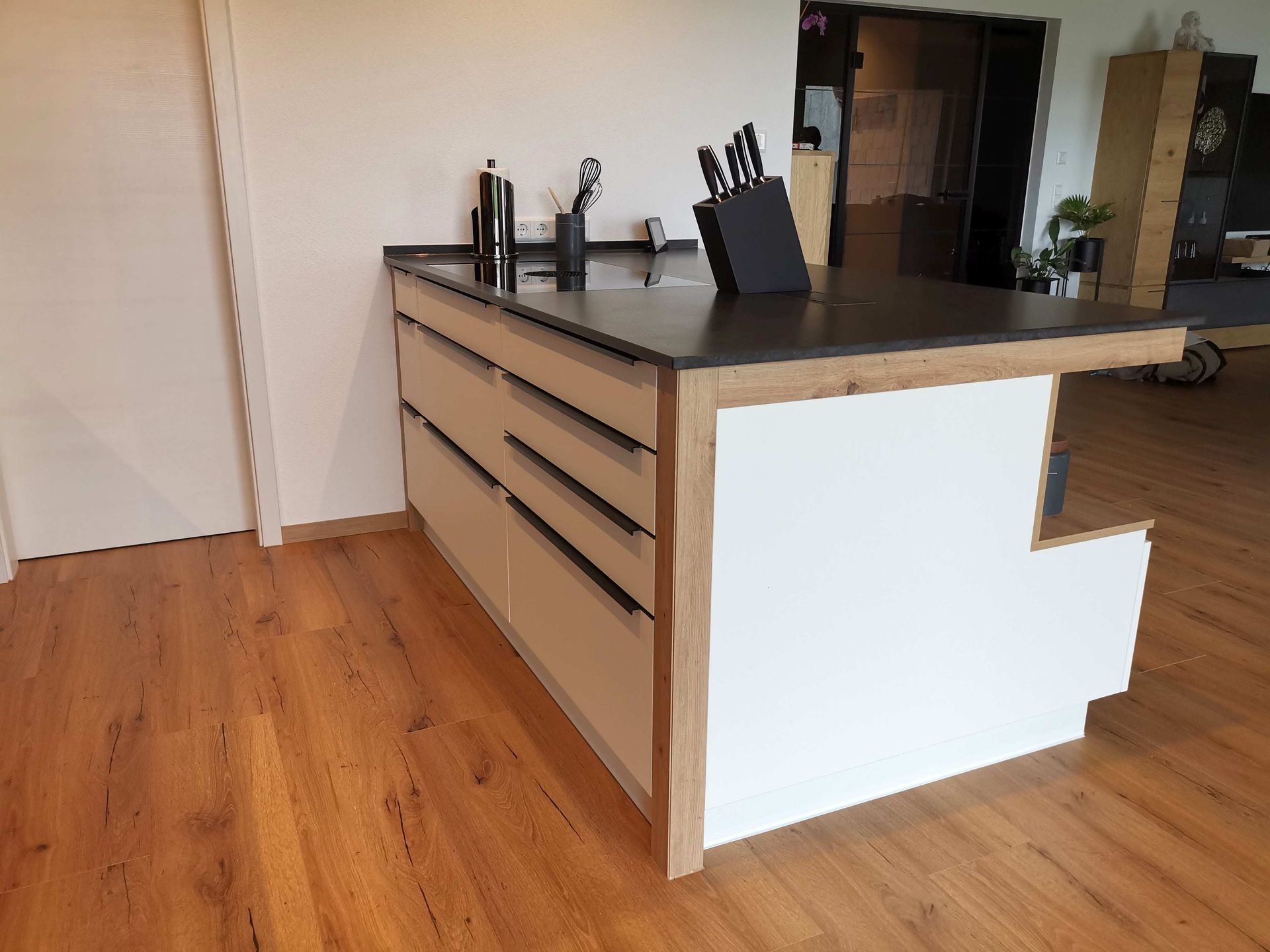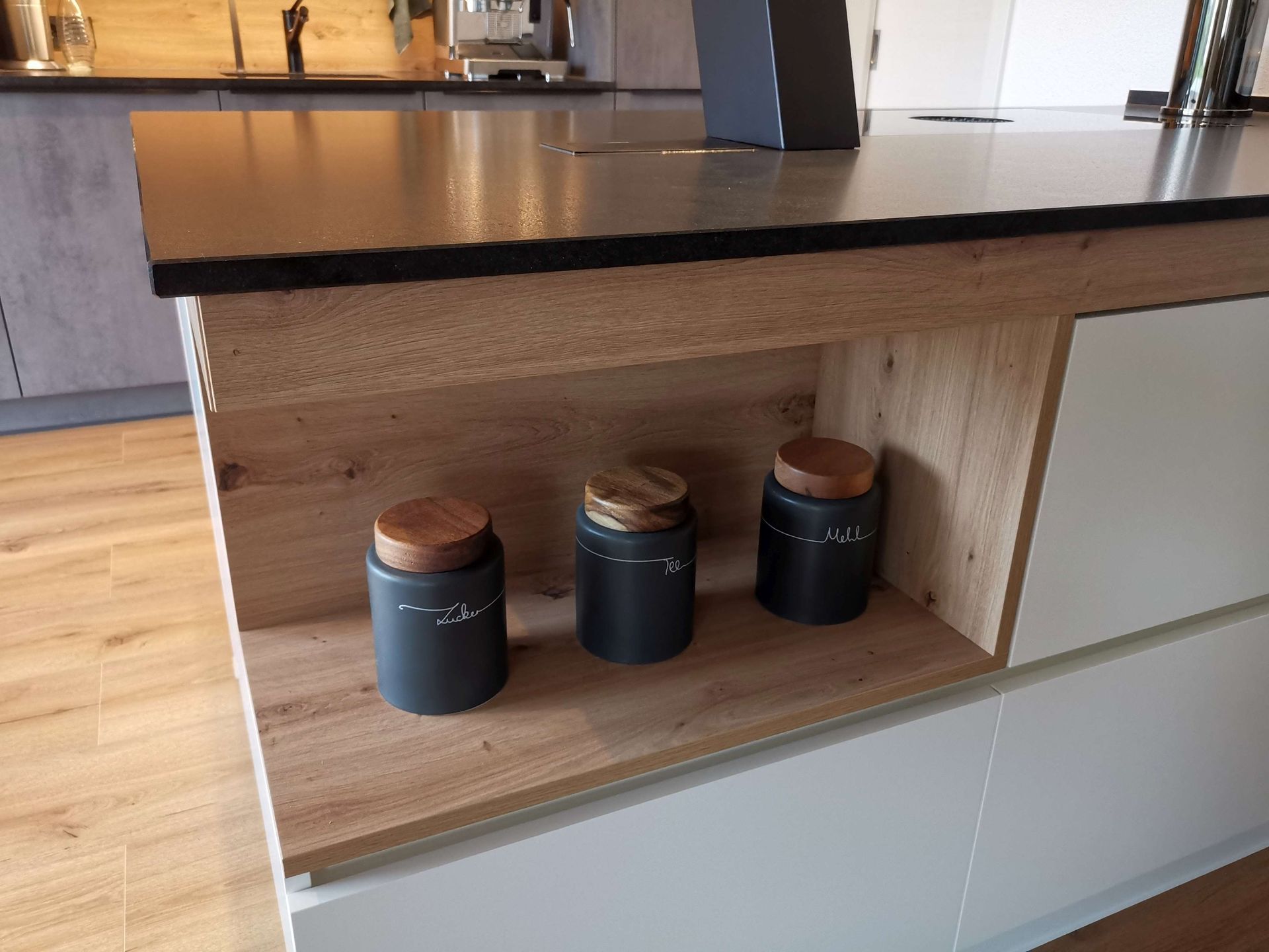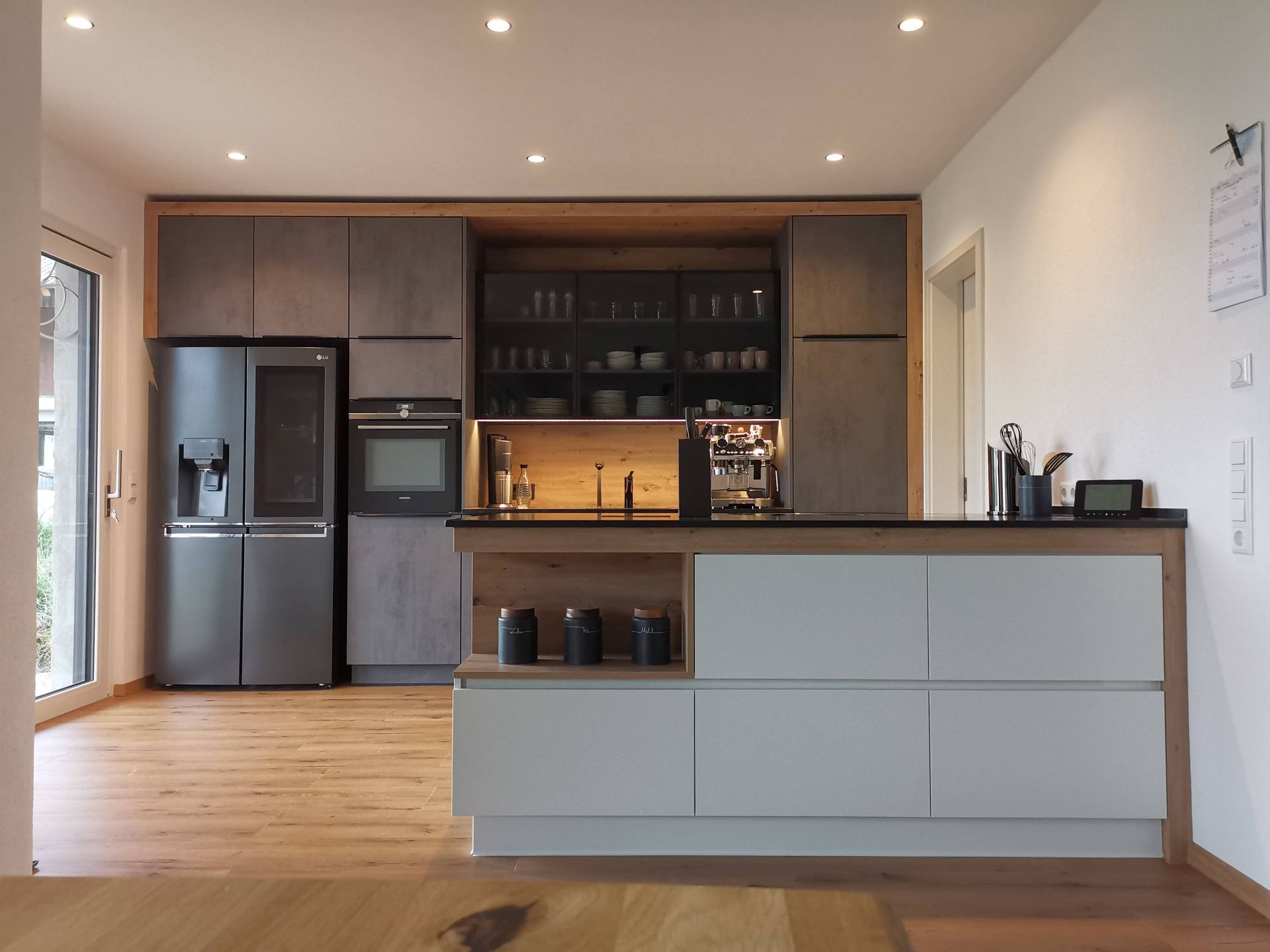 Die anthrazitfarbene Küchenzeile verleiht dem gesamten Raum moderne Eleganz, während der weiße Küchenblock für Kontrast sorgt. Durch geschickt platzierte Elemente in Eiche-Schichtstoff entsteht eine warme Atmosphäre. Pflegeleichte Schichtstoffe vereinen Ästhetik mit Funktionalität, und die durchdachte Kombination bringt zeitgemäße Eleganz und Gemütlichkeit in die Küche.
