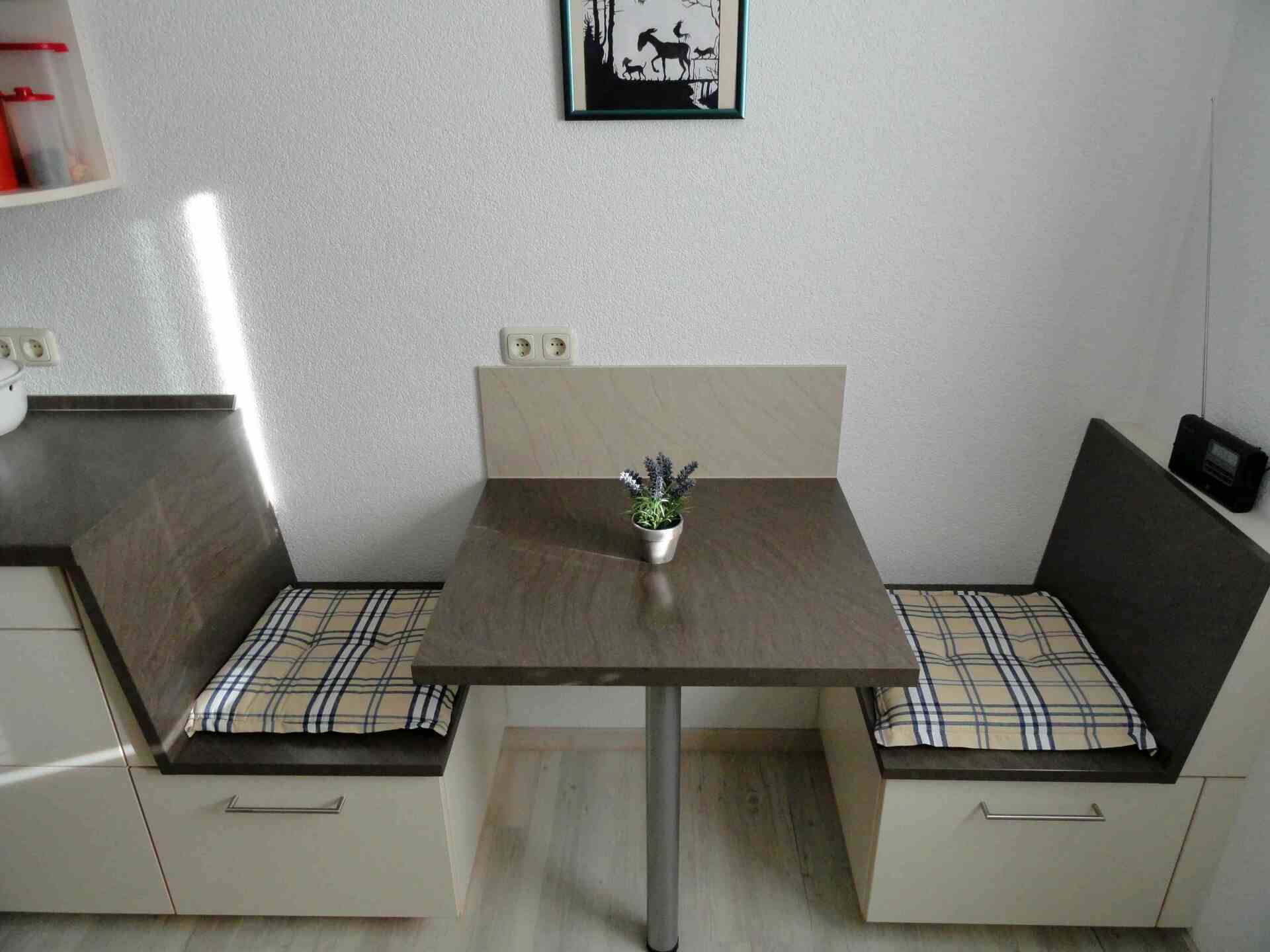 - Dekor Arbeitsplatte - farbgleich die Bänke für die Sitzecke