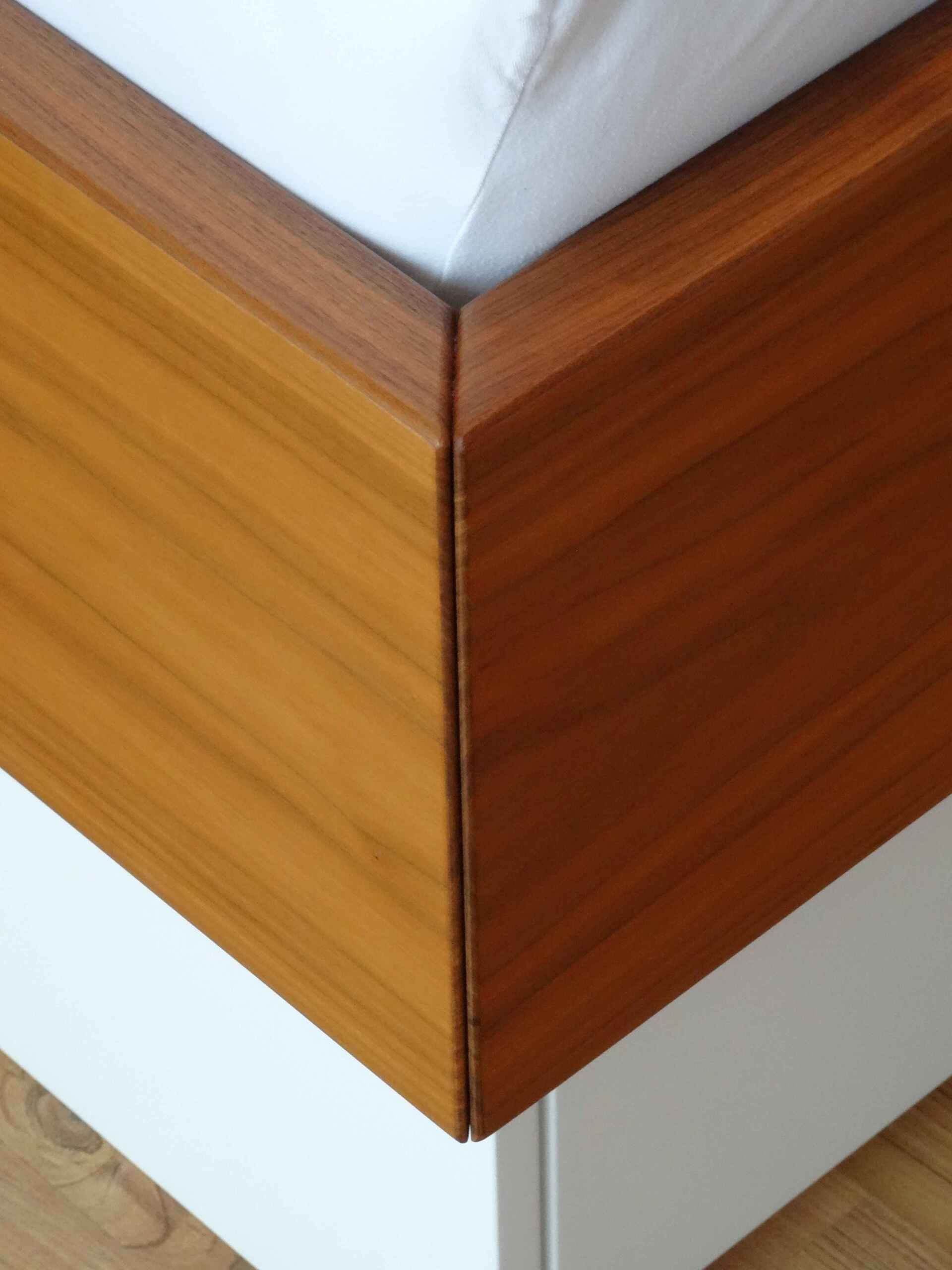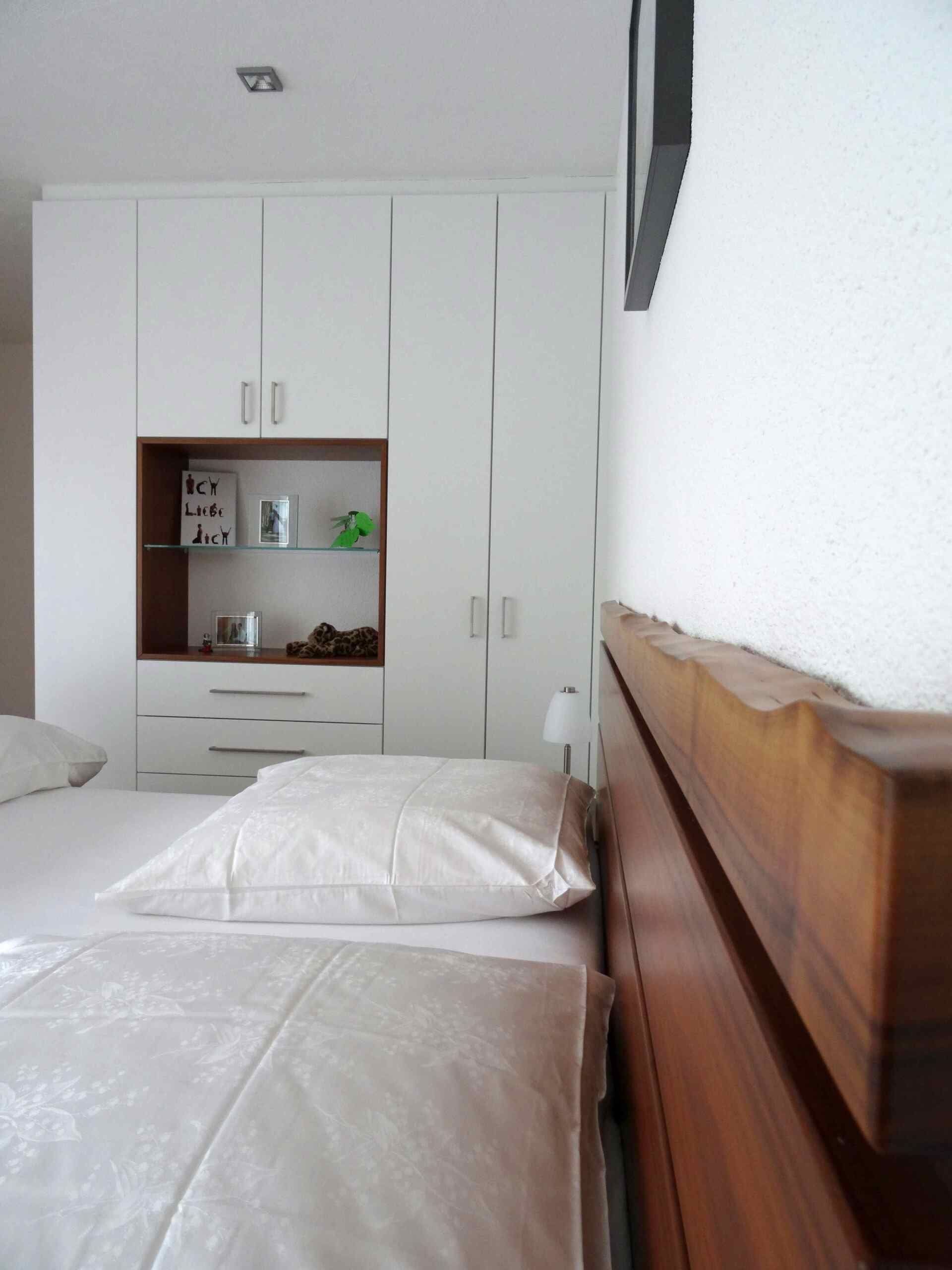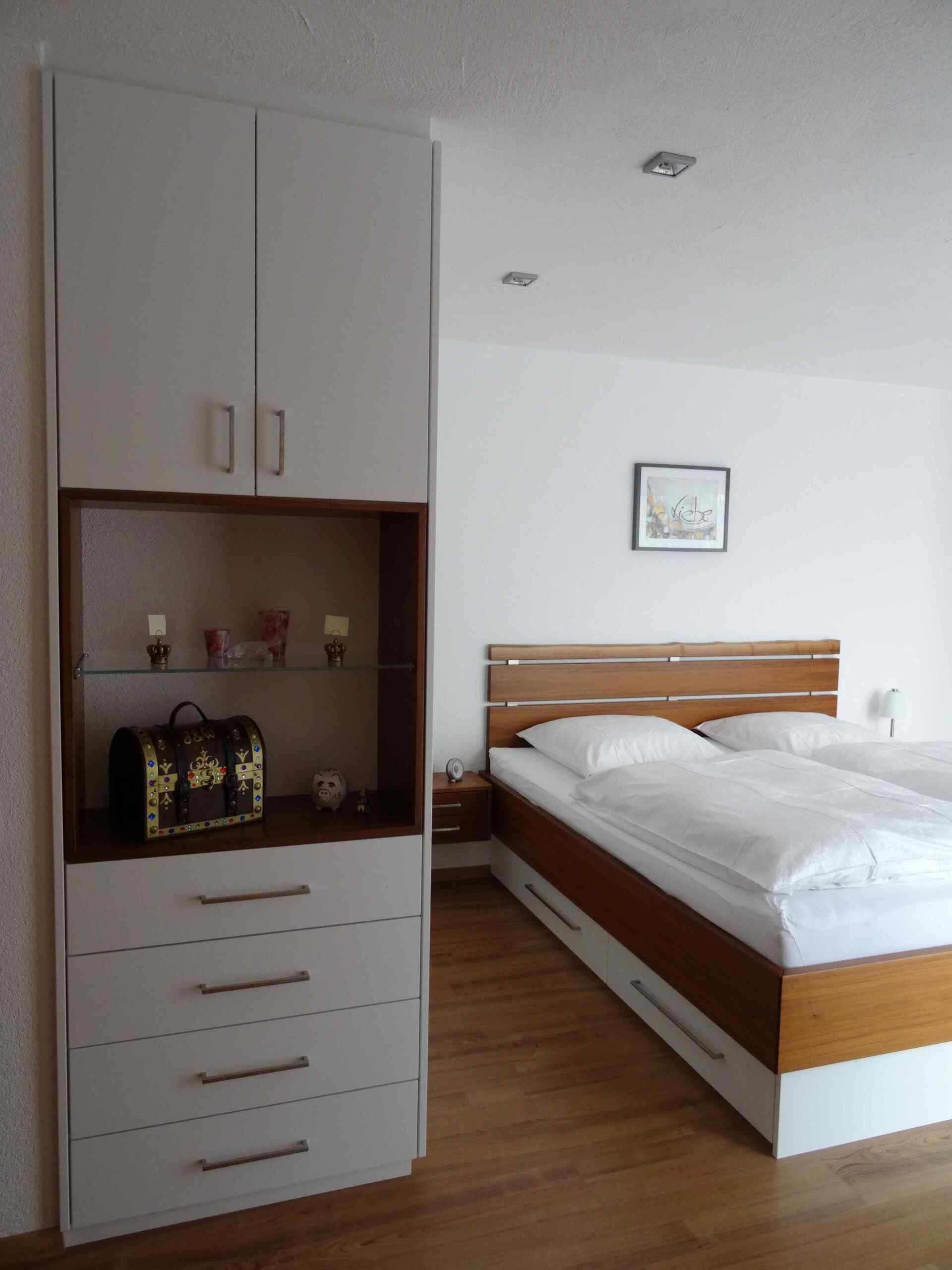 Ein Bett mit Überlänge? - Kein Problem für uns. Jedes unserer Möbelstücke wird unter Berücksichtigung Ihrer Wünsche und Vorgaben individuell für Sie gefertigt. Der Einbauschrank über Eck mit seinen offenen Bereichen rundet das Ensemble gekonnt ab und verleiht dem Raum noch mehr Wohnlichkeit - vom zusätzlichen Platzangebot ganz zu schweigen.