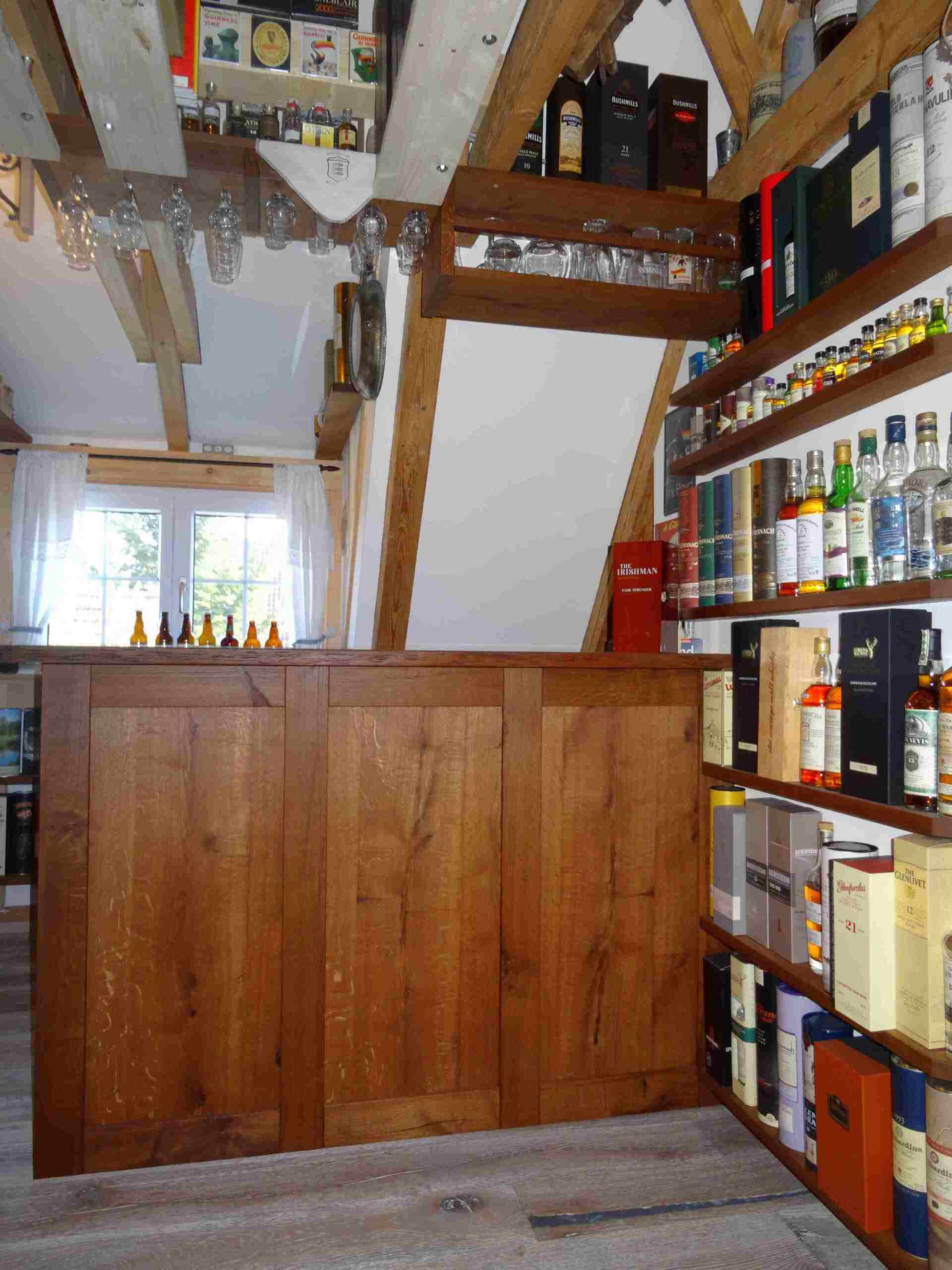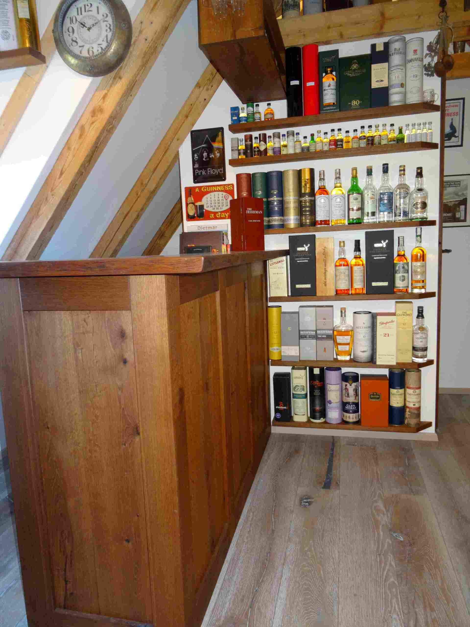 Ein Whiskeyzimmer sieht man nicht alle Tage. Die massive gedämpfte Eiche fügt sich ideal in das vorgegebene Dachgeschoss ein und erzeugt einen rustikalen Flair. Eine Idee und Konzeption wie hier muss gemeinsam mit dem Kunden in Gesprächen und Beratungen reifen - wie ein richtiger Whiskey eben.